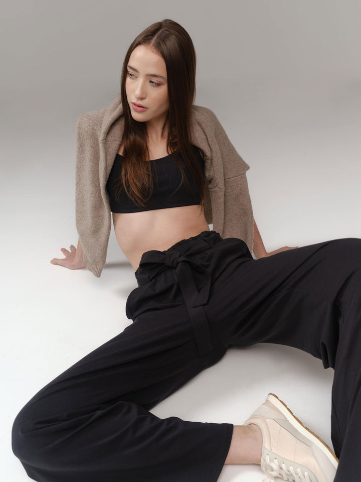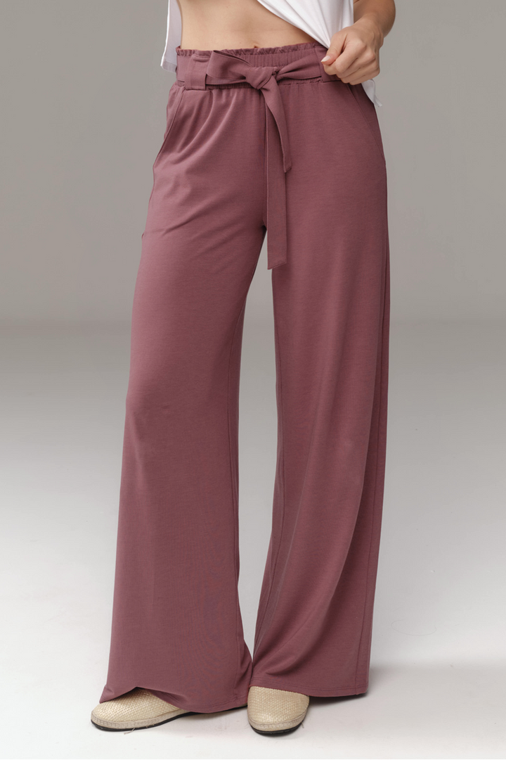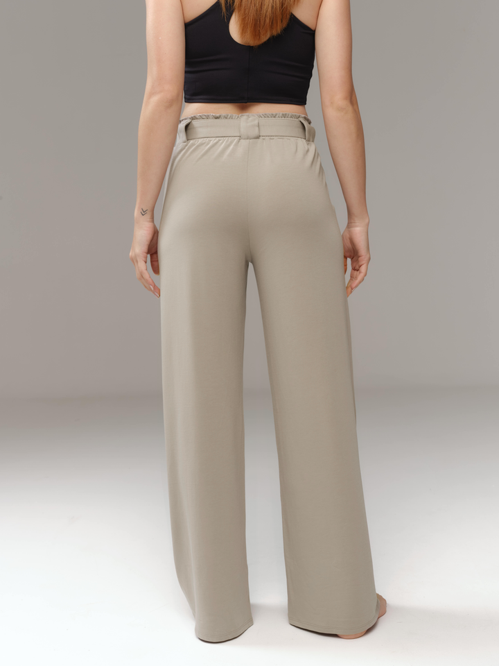 Pantalón hecho en tela que no transparenta, con pretina alta, elástico suave y cinturón de la misma tela. Cuenta con 2 bolsillos laterales.